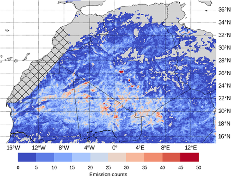- Dust emissions tend to come from the location close to the Algeria-Mali-Niger border triple point (TP) or further to the northwest across the western half of the Mali-Algeria border (MAB). There is an interseason progression of dust emission from the TP to MAB.