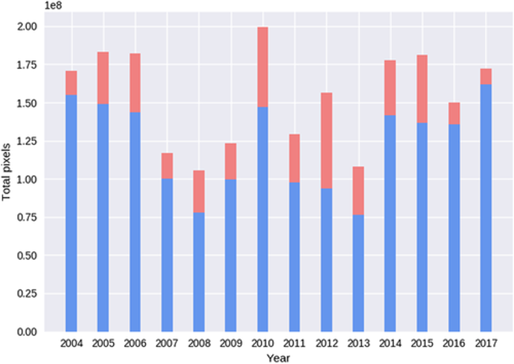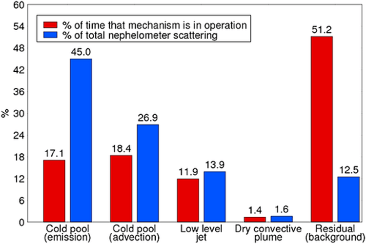 Blue bars represent the percentage of the total nephelometer scattering each mechanism is responsible for. The residual is defined as the background dust loading, i.e., periods when nephelometer scattering is less than 2 × 10−4 m−1 and when no dust events are identified. There is no overlap between any of the categories. The numbers above the bars are the percentage each bar represents, included for clarity. Since the whole duration of the Fennec Intensive Observation Period is represented, the values of the blue and red columns sum to 100