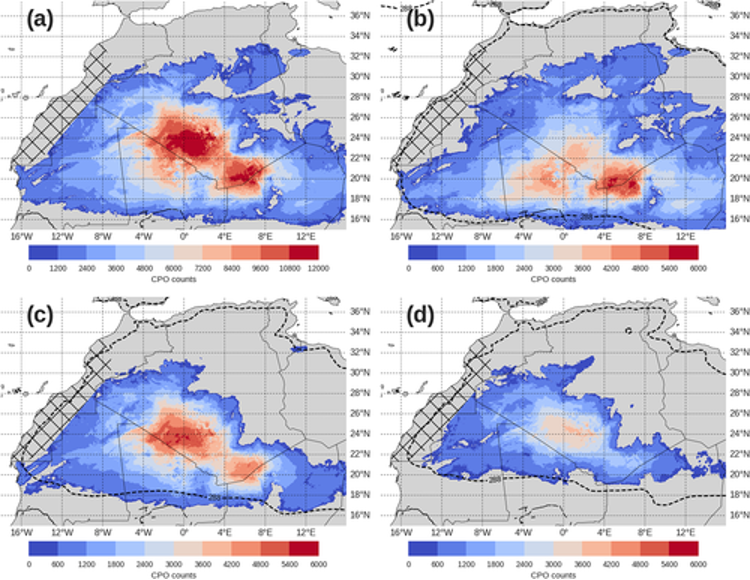 - Cold pool outflows (CPO) are widespread across central and western Sahara, these peak in August close to the Mali-Niger-Algeria triple point.