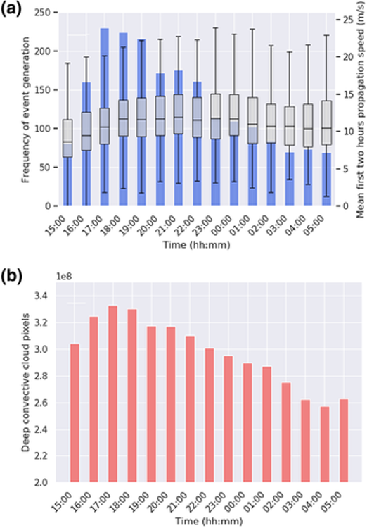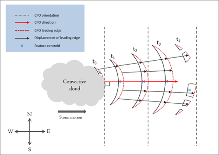 (b) shows the mechanics of a cold pool outflow associated with a mature convective system, with the cold pool region delineated in dashed blue. (See Caton Harrison et al., 2019 https://doi.org/10.1029/2019JD030291 for more details)