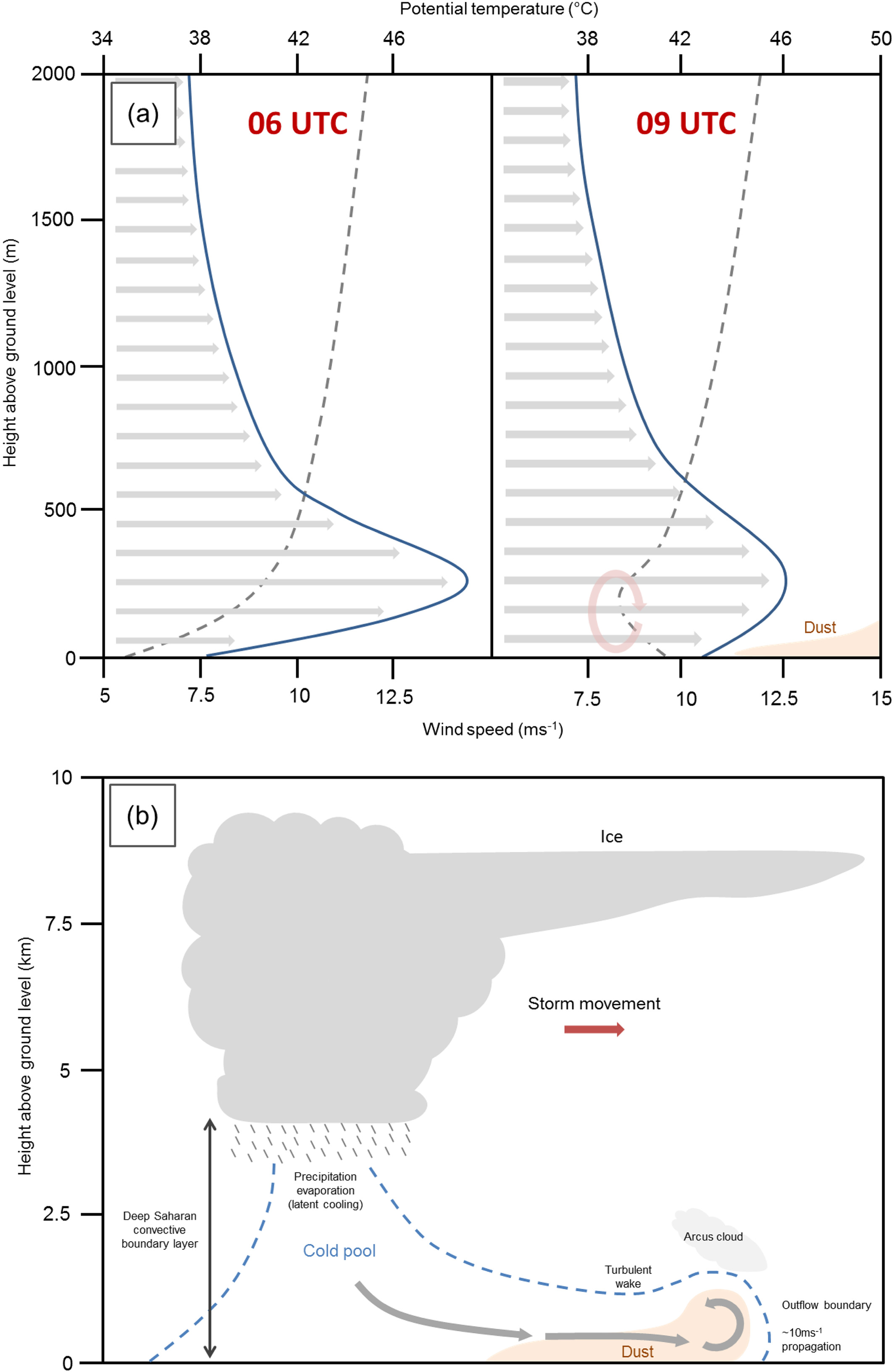 (a) shows the nocturnal low‐level jet as typical summertime central Saharan wind (solid blue) and potential temperature (dashed gray) profiles at 0600 UTC (left panel) and 0900 UTC (right panel). Convective turbulence in the morning mixes momentum from aloft to the surface, raising dust.