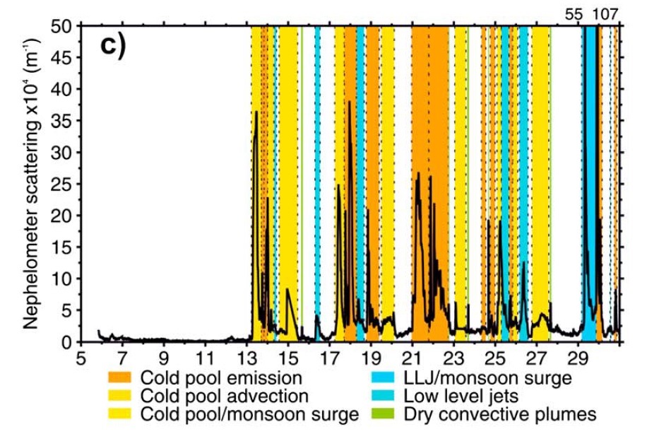 Dr Christopher Allen analyzed the Fennec ground observations and came to a surprising conclusion: the most important dust-producing mechanisms were associated with water, specifically, the West African Monsoon. The monsoon could raise dust as an intrusive surge, promote low-level jets or, most commonly, supply moisture for thunderstorms whose downdrafts caused highly efficient dust storms known as cold pool outflows.